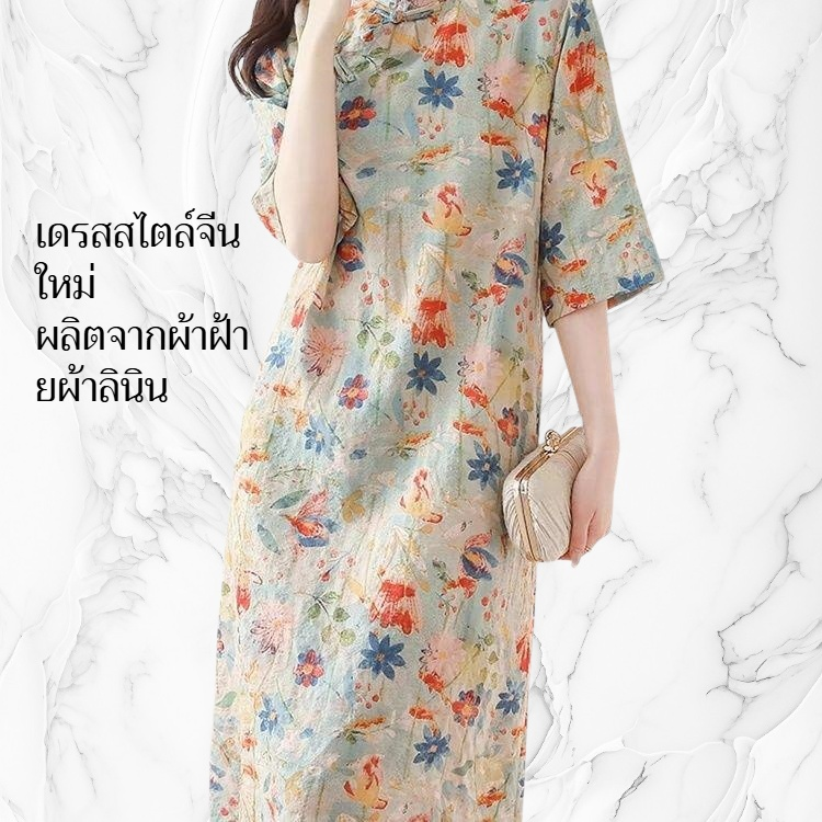 เดรสสไตล์จีนใหม่ ผ้าฝ้ายผ้าลินิน คอจีนติดกระดุม ลายดอกไม้ แขนสั้น ใส่สบายในฤดูร้อน