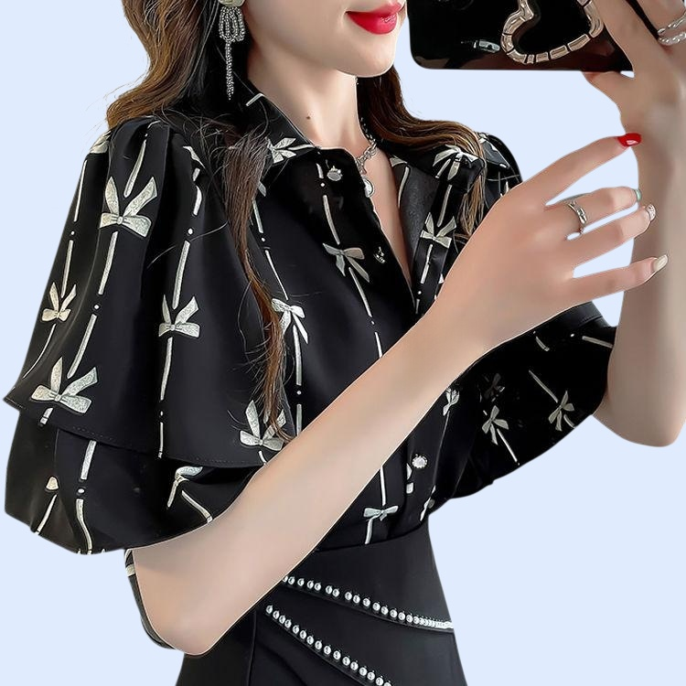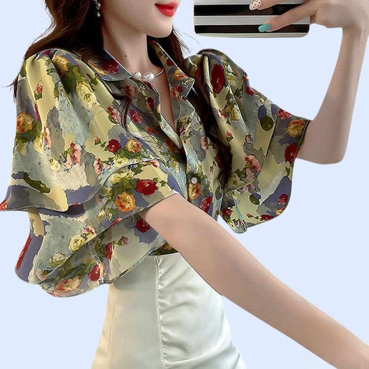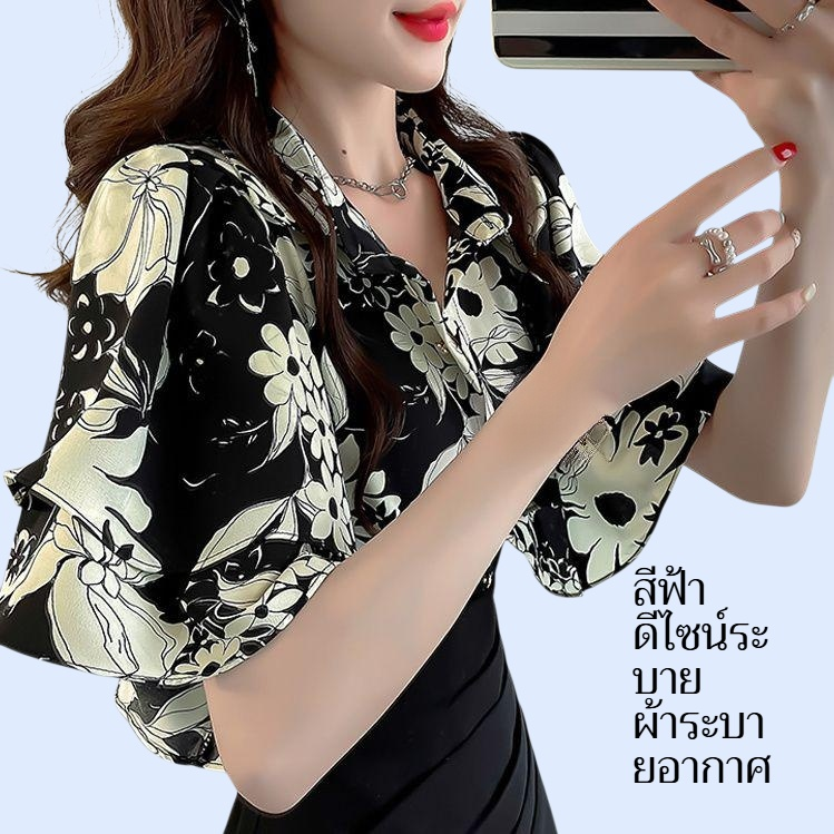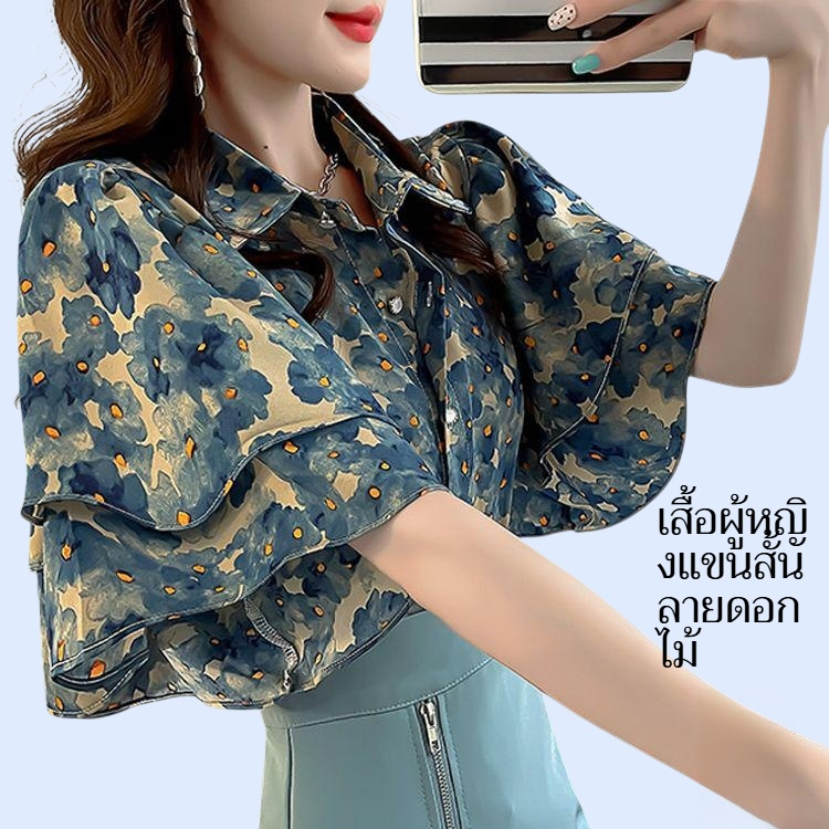 เสื้อผู้หญิงแขนสั้นลายดอกไม้ สไตล์หวาน สีฟ้า ดีไซน์ระบาย เนื้อผ้าบางเบา ระบายอากาศดี เหมาะสำหรับหน้าร้อน สวมใส่ง่าย แมทช์ได้หลายลุค
