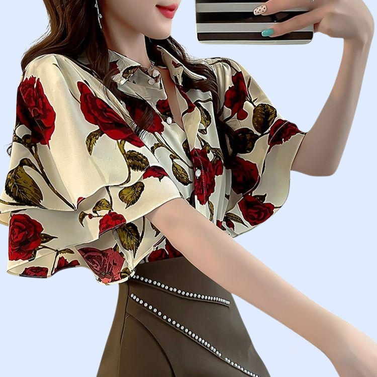 เสื้อผู้หญิงแขนสั้นลายดอกไม้ สไตล์หวาน สีฟ้า ดีไซน์ระบาย เหมาะสำหรับหน้าร้อน
